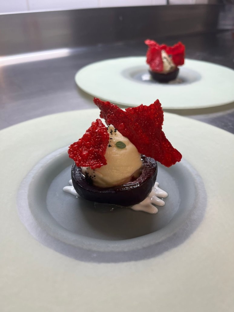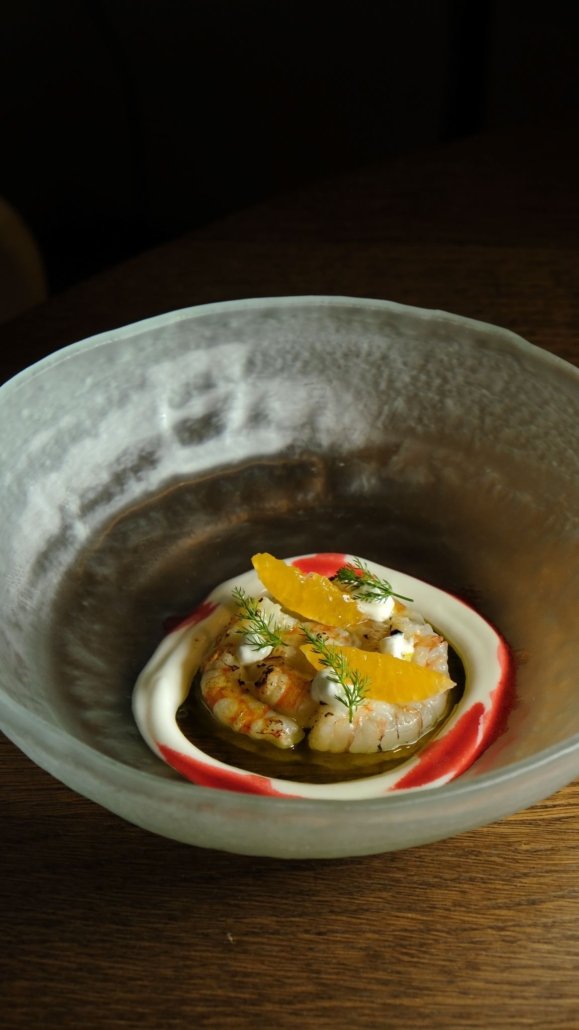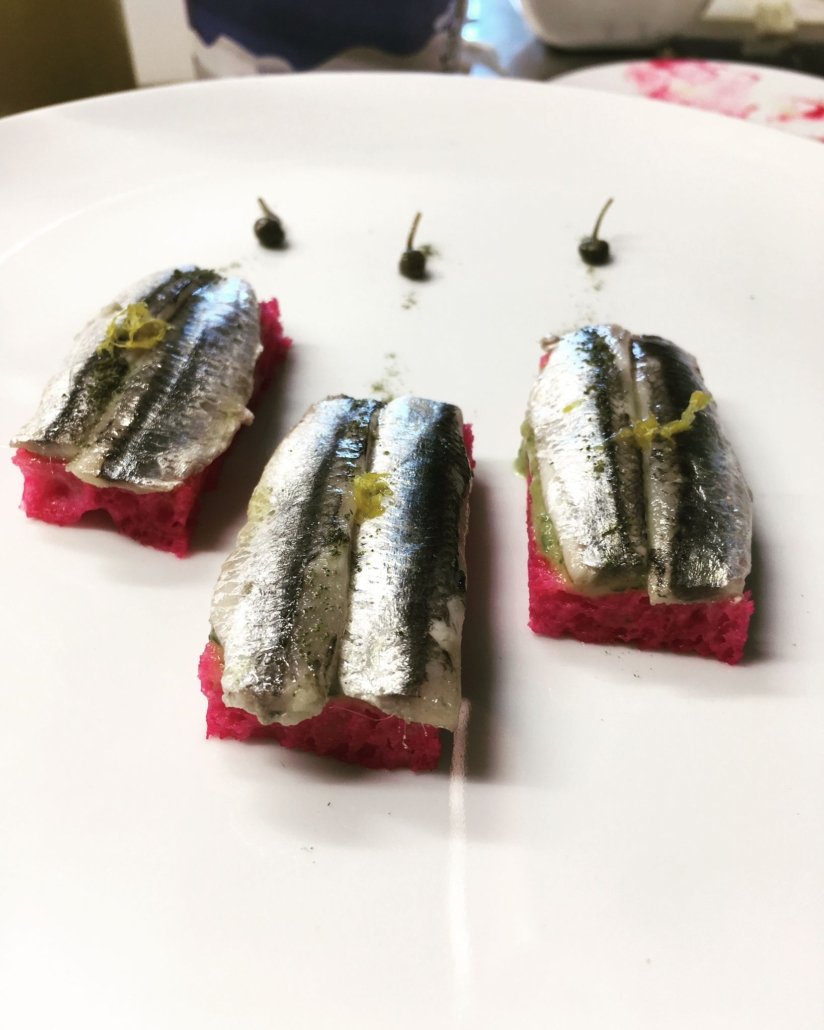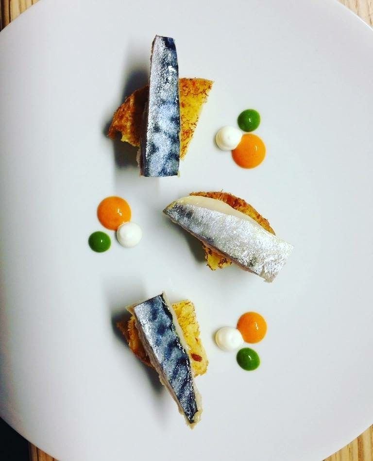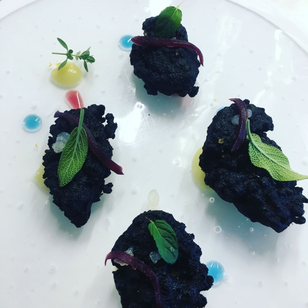 Carpaccio di pescato, erbette della macchia mediterranea, limone fermentato e nero di seppia
