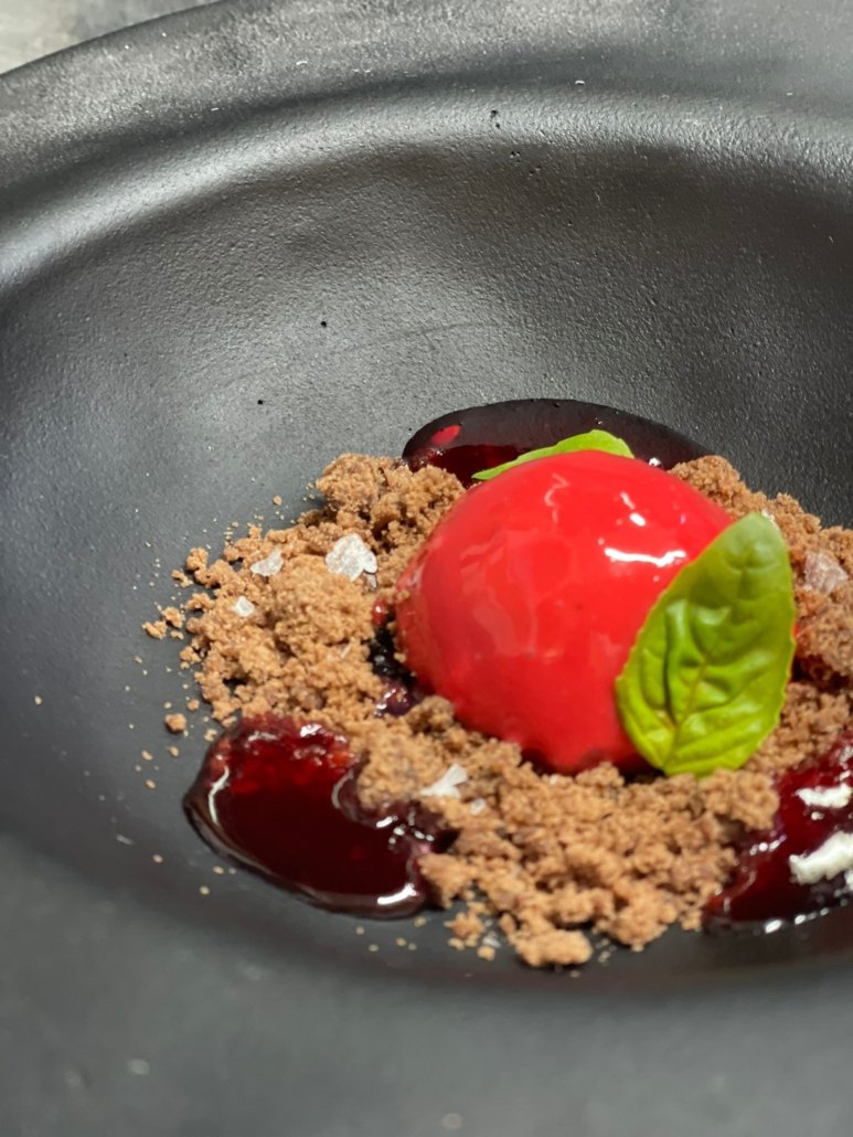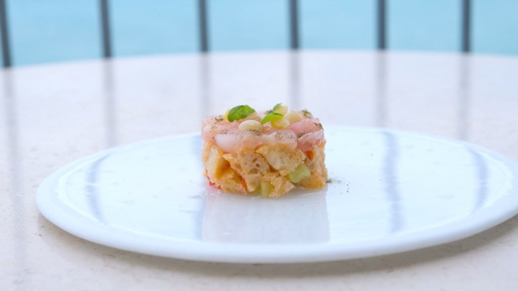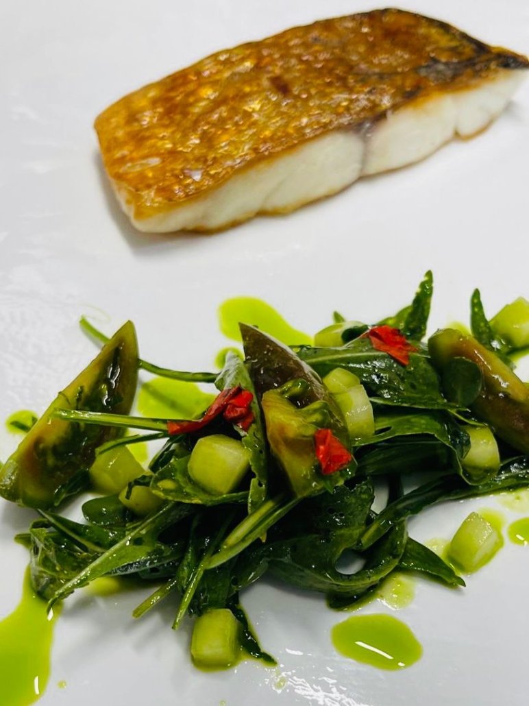 Orata stagionata, il suo jus, insalata di primavera e olio al basilico